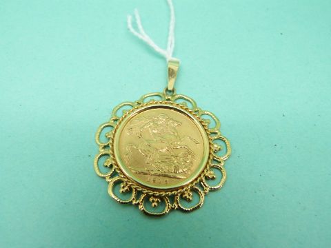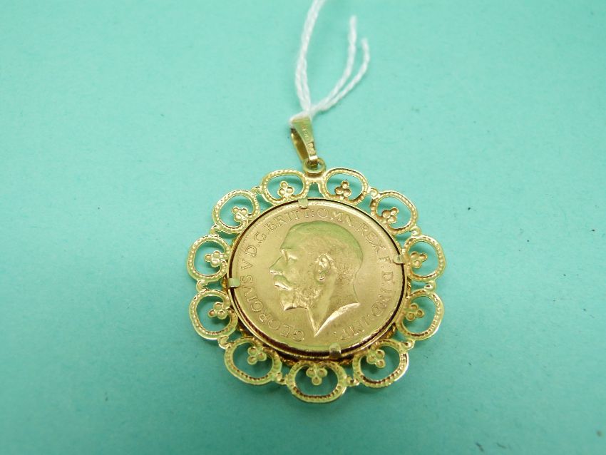 A 9ct gold pendant set with a 1915 full gold sovereign, 10.2g