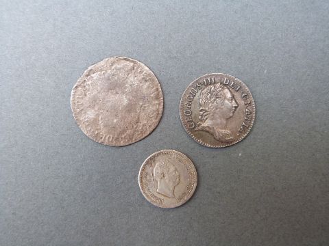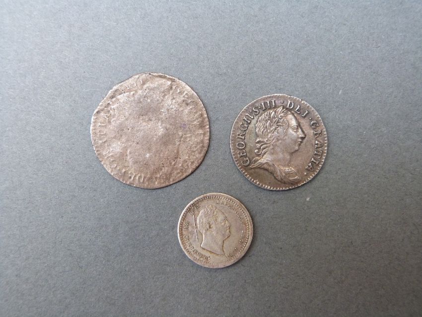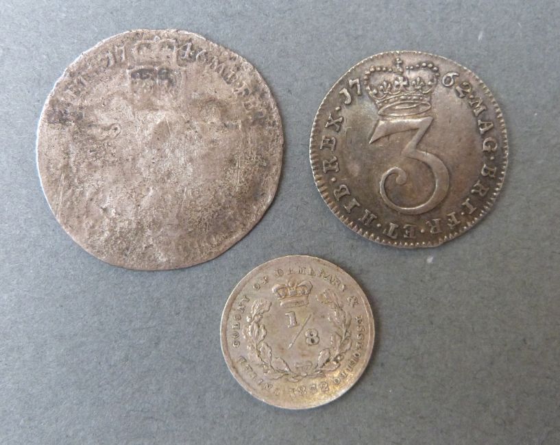 George III young head 1762 maundy 3d VF together with an 1832 1/8 Demerary Gilder of William IV and a 1746 George II Lima 6d, poor but legible