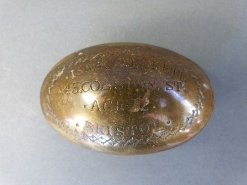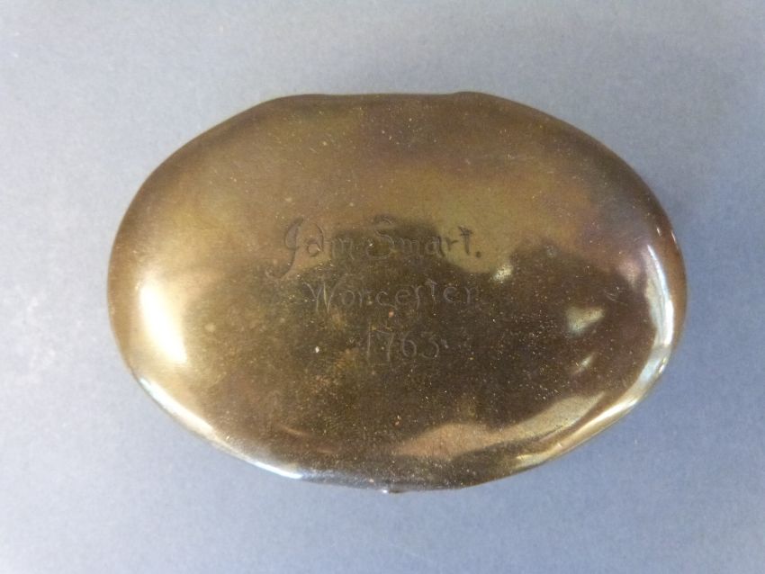 Three brass snuff boxes/pots, one engraved Isaac Bennett, 45 Colston St, age 32, Bristol and another engraved John Smart, Worcester 1763