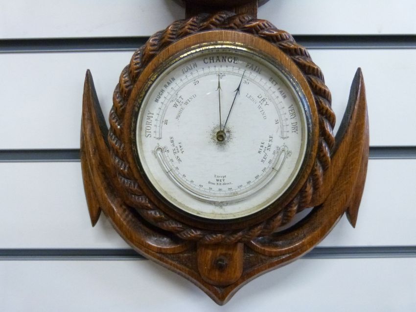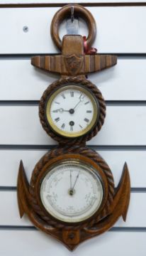 A late 19thC oak cased clock barometer carved in the form of a rope and anchor, the enamelled Roman clock dial with breguet style hands and gilt Greek key bezel surround