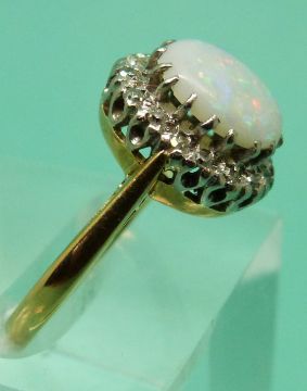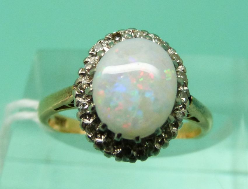 An 18ct gold ring set with an opal cabochon surrounded by diamonds (size J)