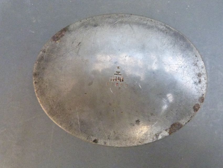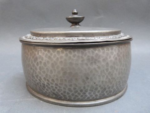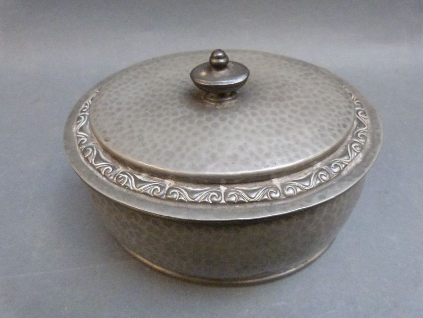 An oval Tudric pewter dressing table pot with hammered decoration, width 14.5cm