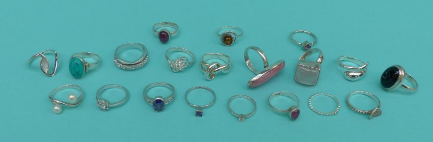 A collection of silver jewellery to include 21 silver rings, silver bangle, silver and agate necklace, 9ct gold ring, RAF brooch etc