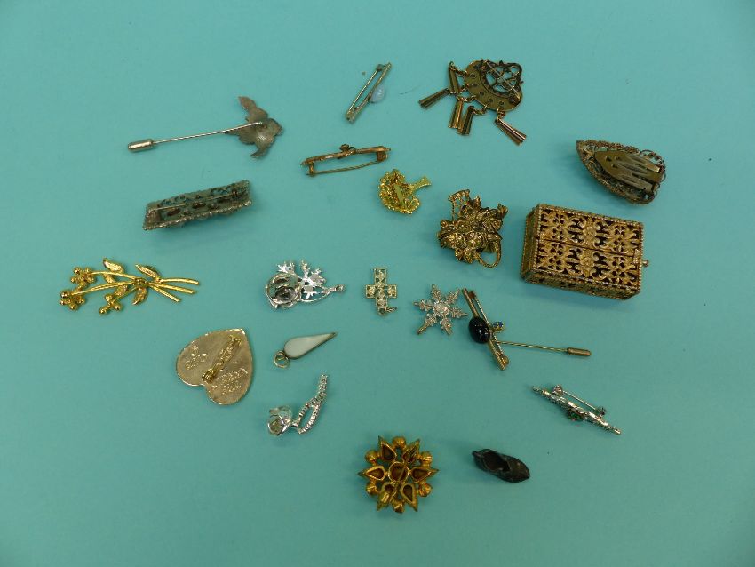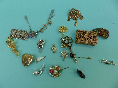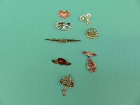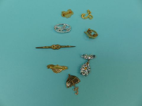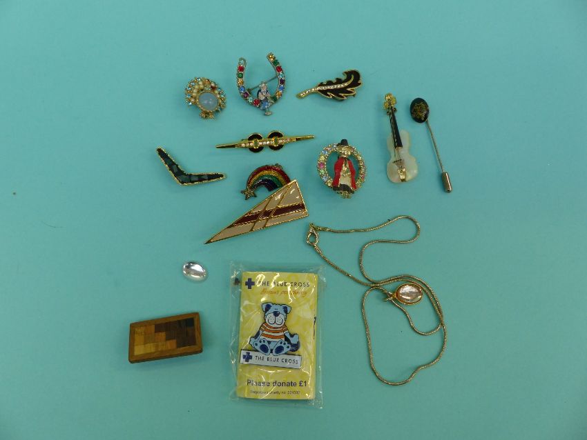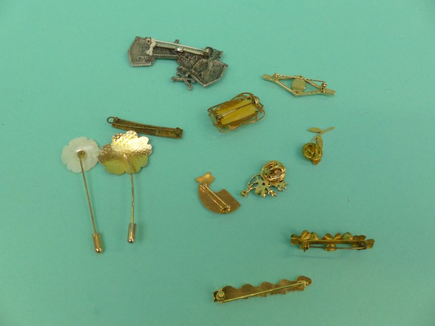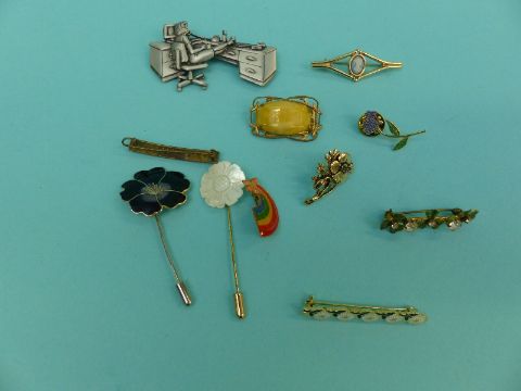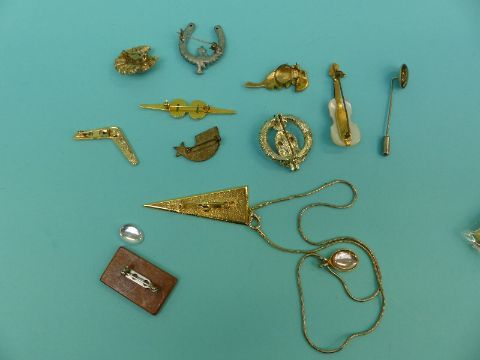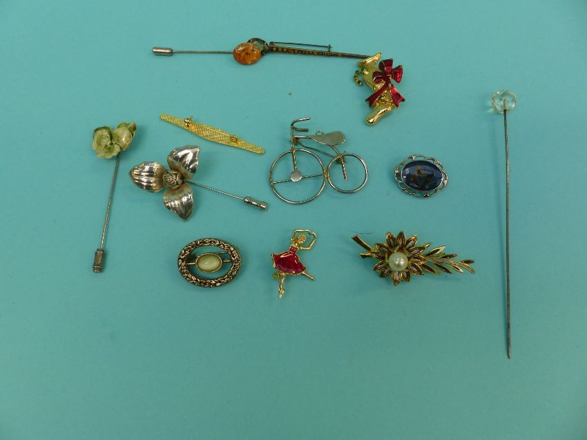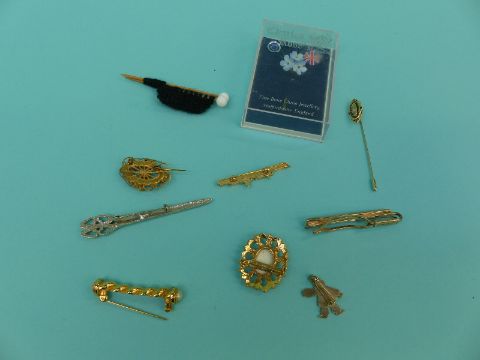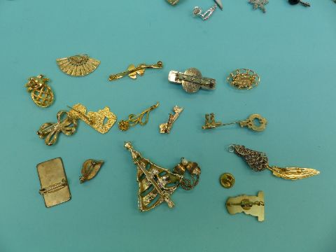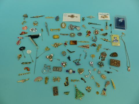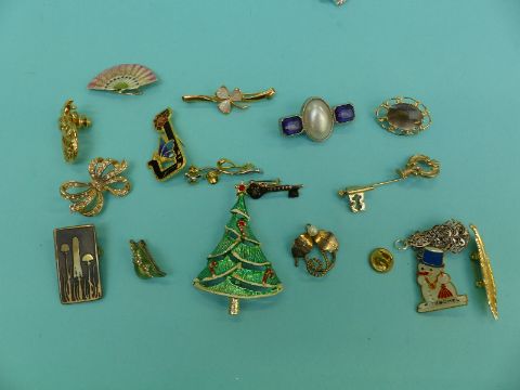 A large collection of various brooches, tie clips/pins, hat pins etc including floral, keys, Christmas, violin, ship, fan, ballet dancer, penny farthing, horseshoe, variety club etc