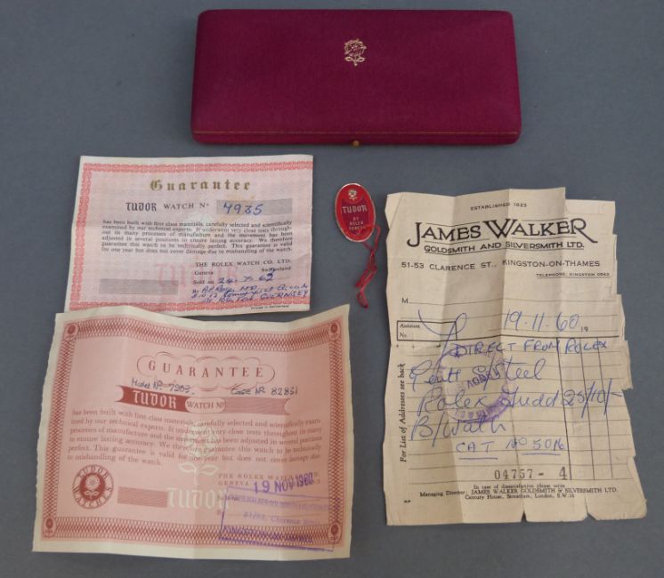 Tudor Oyster Royal gentleman's stainless steel wristwatch with gold and luminous hands, gold Arabic numerals and champagne face, on stainless steel bracelet, marked to the back of the case 'Rolex Geneva Original Oyster Case', case diameter 32mm, ref 7935, in original box with related paperwork dated 1962.