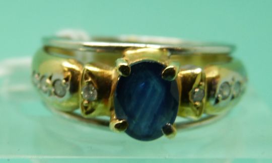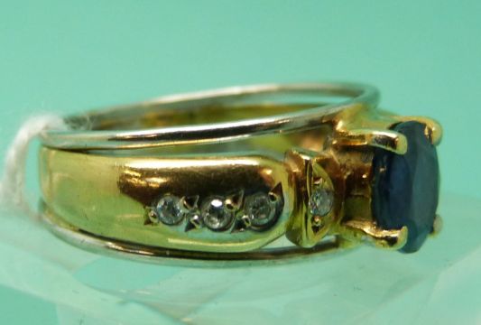 A yellow metal bi-coloured ring set with an oval sapphire and diamonds (size L)