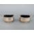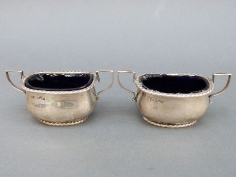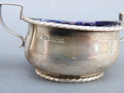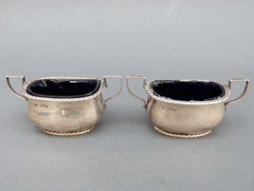 A pair of hallmarked silver two-handled open salts with blue glass liners, Sheffield 1907 and 1910, maker Atkin Brothers, length 9.5cm, weight of silver 119g