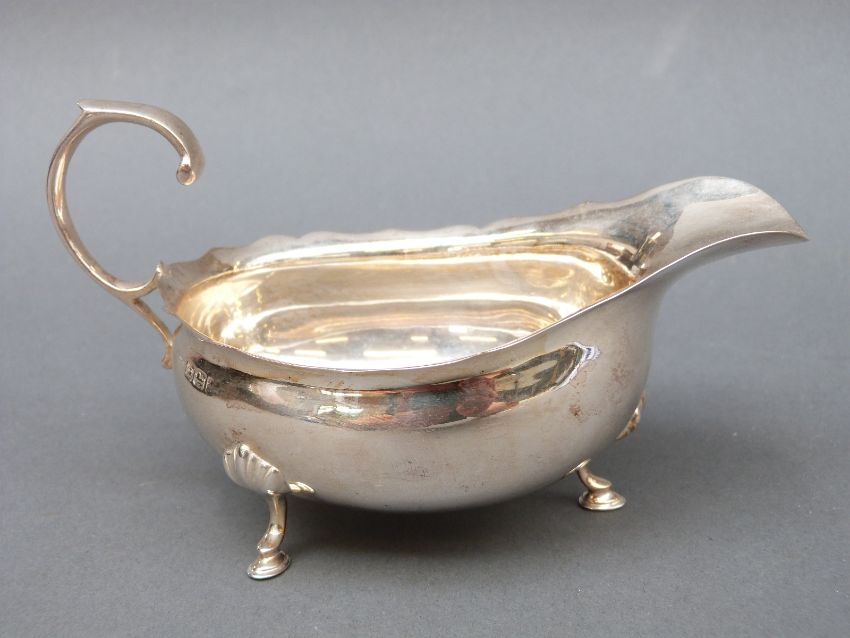 A Edward VII hallmarked silver sauce or gravy boat with scroll handle raised on three feet, Sheffield 1901, maker Atkin Brothers, length 14.5cm, weight 102g