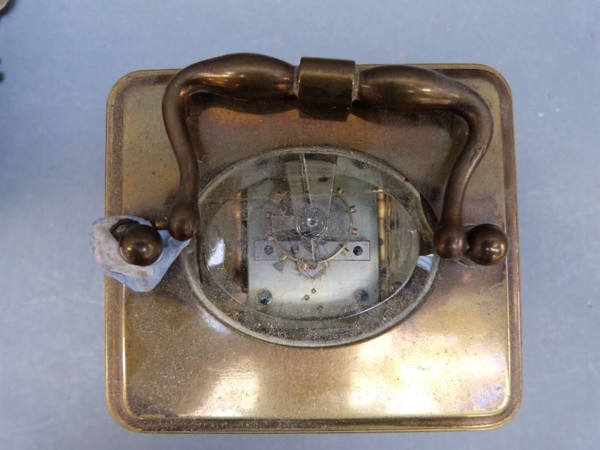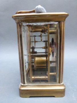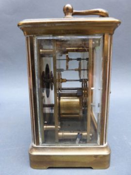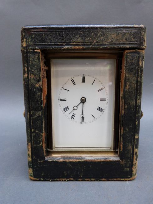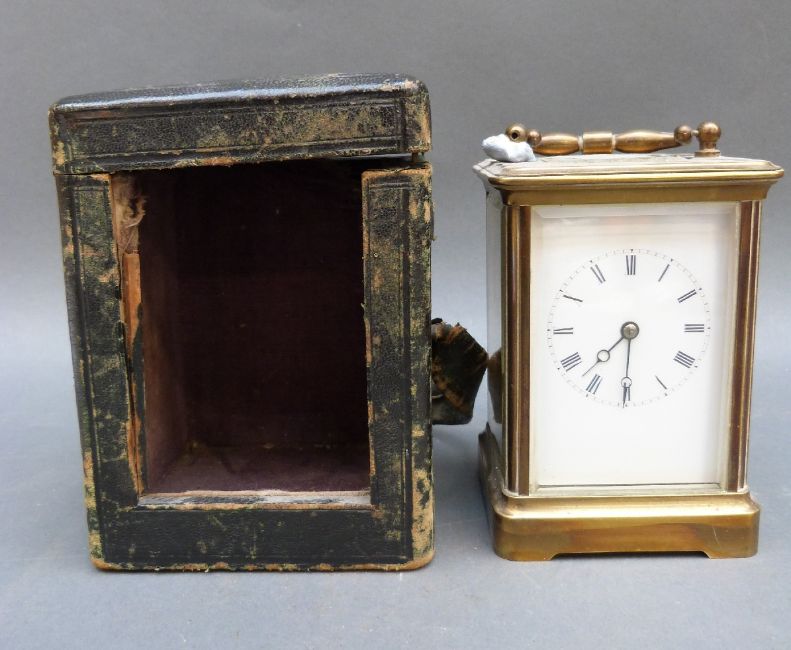 Brass corniche style French carriage clock with enamelled Roman dial, breguet style hands, no. 4632 to movement complete with carrying case, 14cm tall