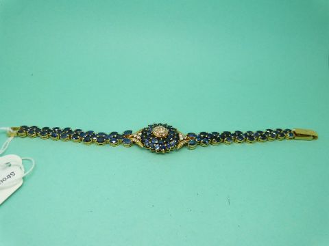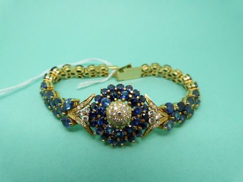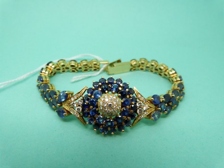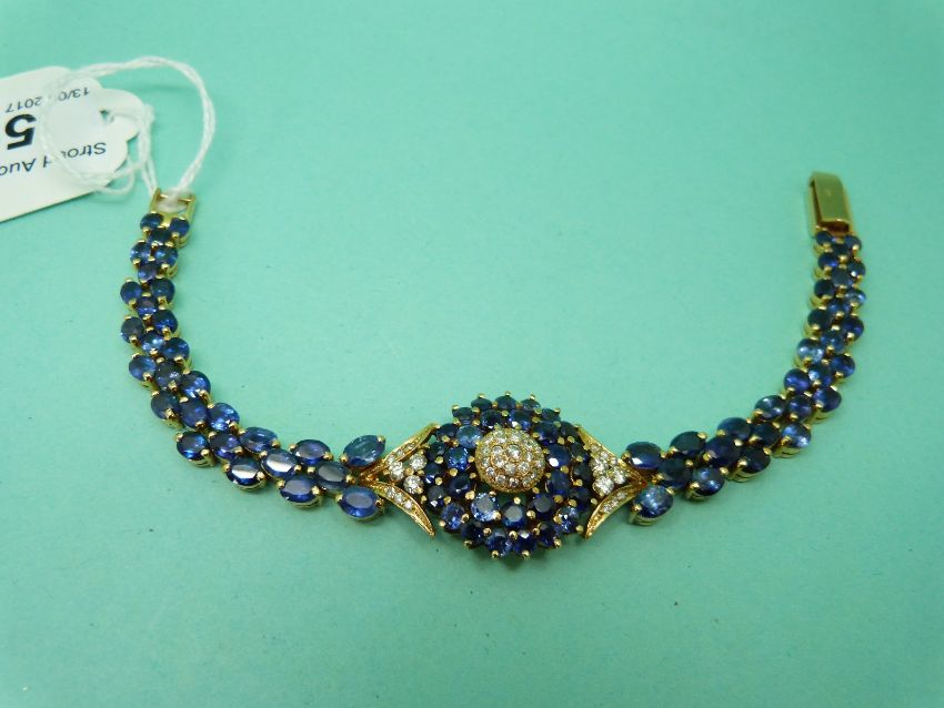 An 18ct gold bracelet the central circular panel set with diamonds totalling approximately 1.3ct surrounded by two rows of round cut Ceylon sapphires, thirty-one stones in all. The strap further set with three rows rows of oval cut Ceylon sapphires, fifty-eight stones in all (34.4g)