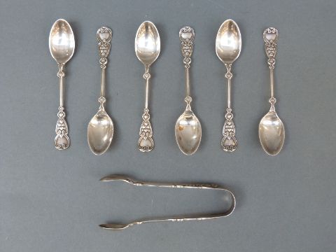 A set of six Art Nouveau style hallmarked silver teaspoons and matching tongs, Sheffield 1908, maker Joseph Rodgers & Sons, weight 120g