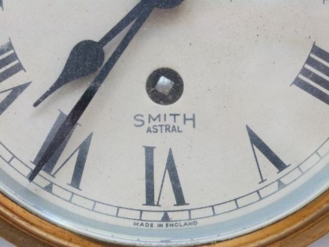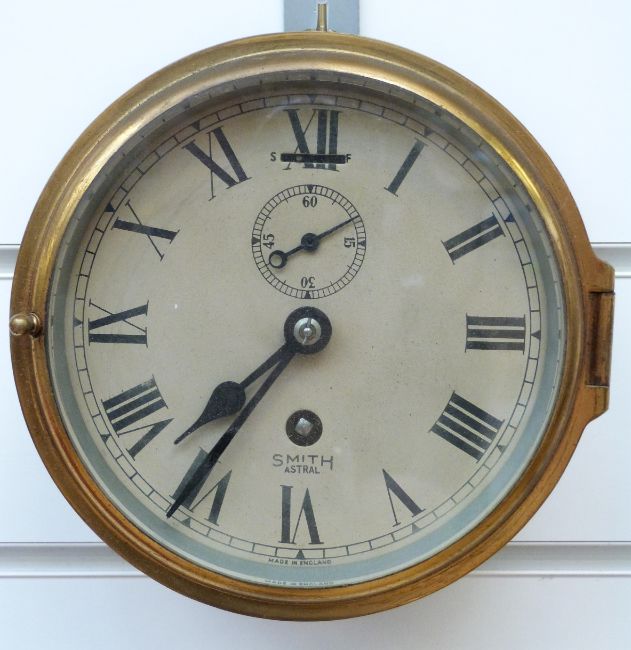 A mid 20thC brass cased Smiths Astral ship's bulkhead timepiece, the Roman ivory coloured dial with spade hands and Arabic secondary seconds dial, 18cm diameter