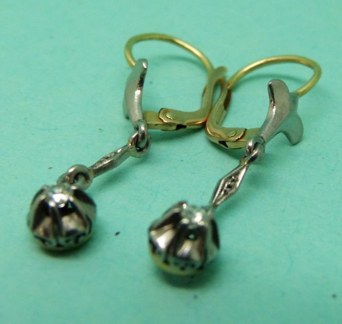 A pair of 18ct gold earrings set with a diamond to each and fleur de lys decoration