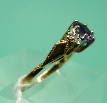 A 9ct gold ring set with an amethyst and two diamonds (size J)