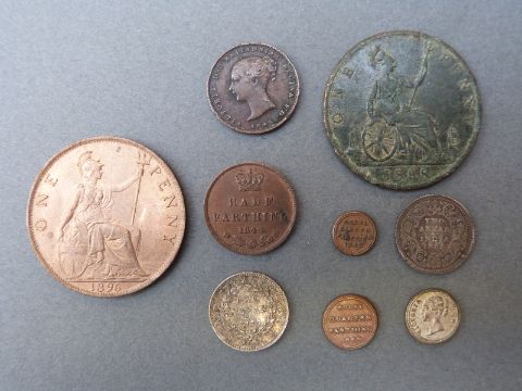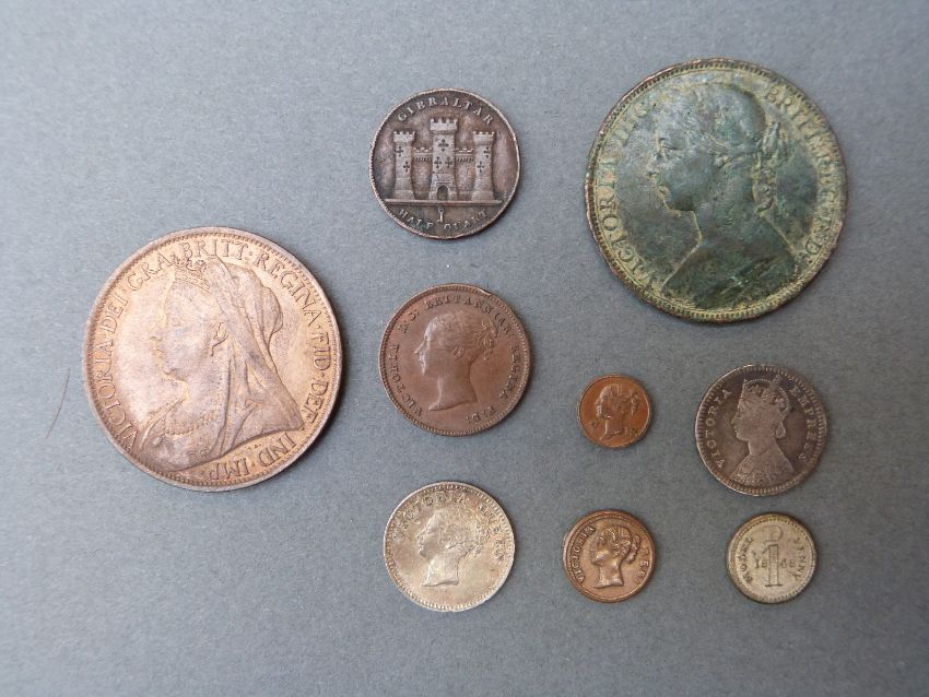 An interesting cachet of Victorian coins to include model penny, farthing fractions etc VF-EF 1896 penny with lustre, Gibraltar half quart 1842