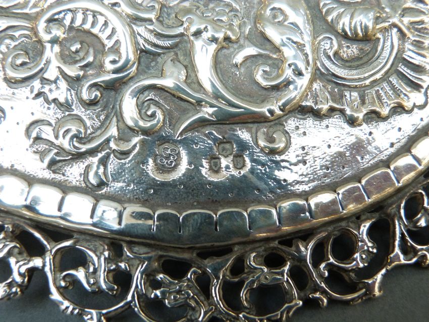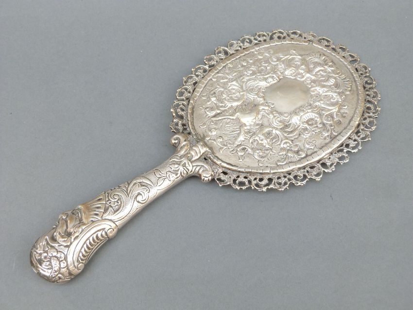 A Victorian hallmarked silver hand mirror with embossed decoration and face to handle, London 1892 maker Edward Brown, length 31cm