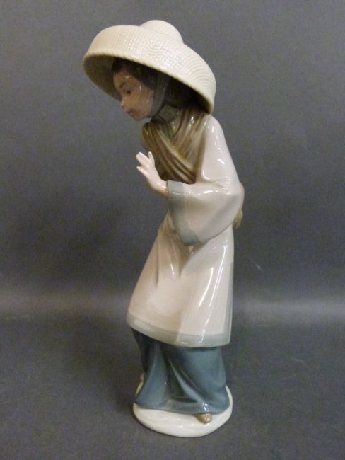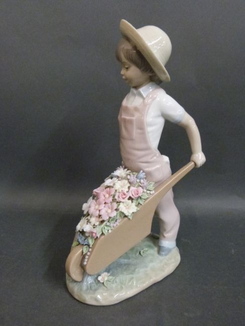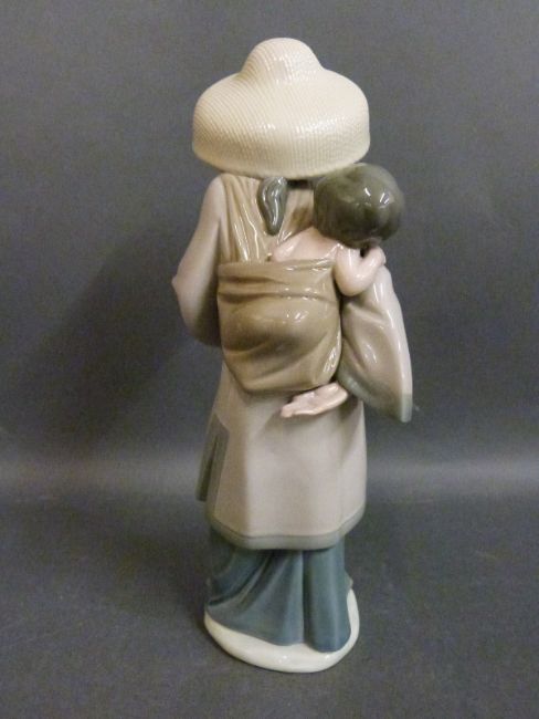Two Lladro figures, one a Chinese lady with a baby on her back, the other a girl with a wheelbarrow of flowers
