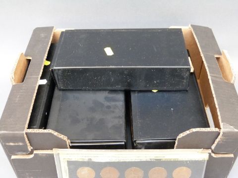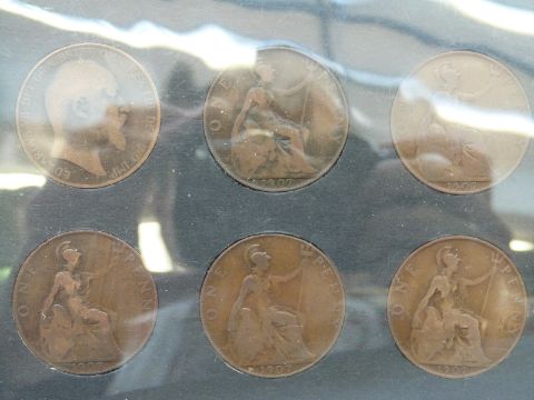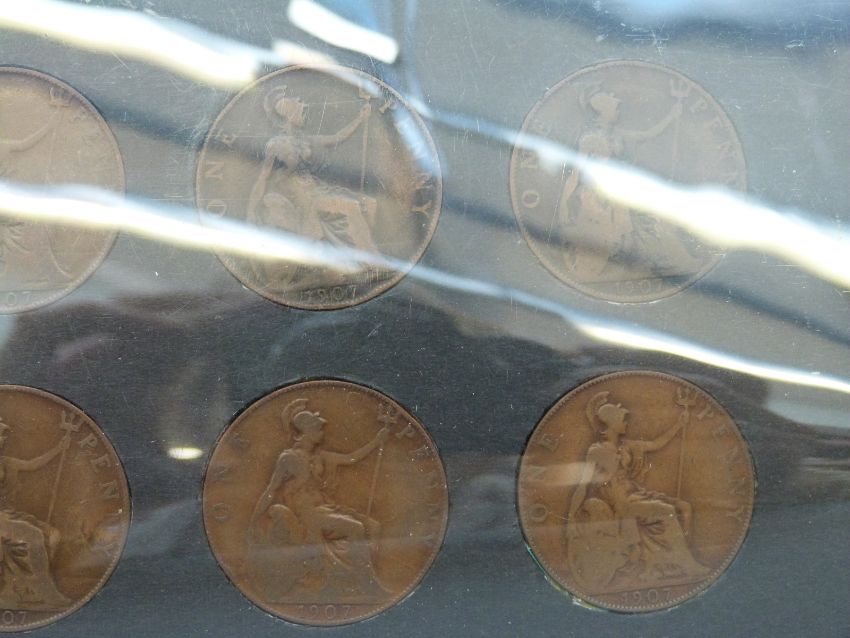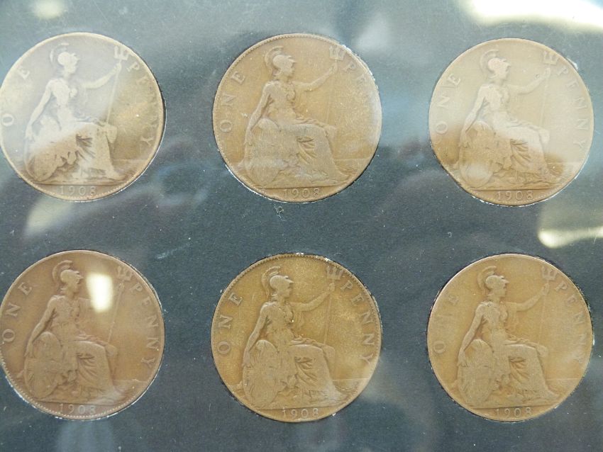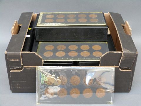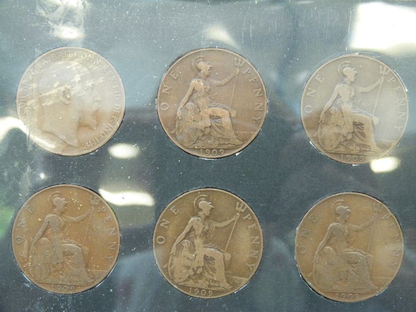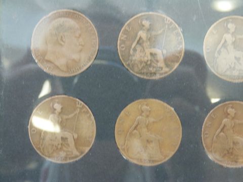 An amateur collection of Edwardian and Victorian pennies, many in only just fine condition, all set in collector's cards, together with a few Georgian coins fine, George II Hibernia - George III and George IV, approximately 300 coins in all