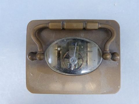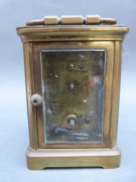 Mappin & Webb French brass corniche style case carriage clock with enamelled Roman dial, 11cm tall