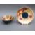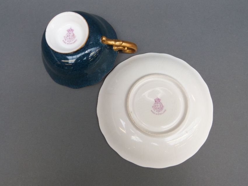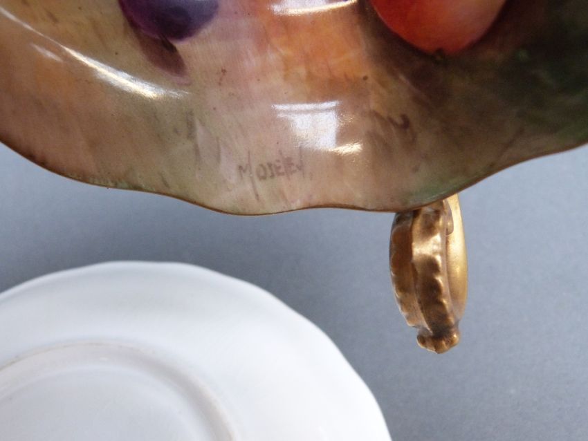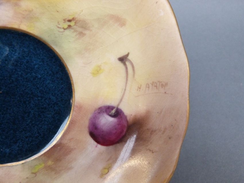Royal Worcester painted fruit cup and saucer with speckled teal ground, the cup signed Moseley and the saucer Ayrton, both with puce marks