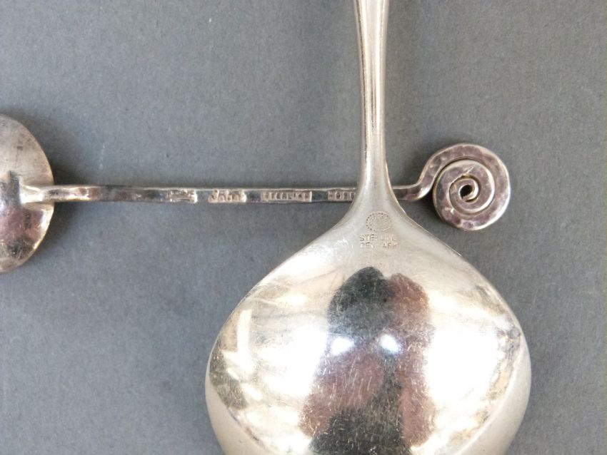 A pair of Georg Jensen white metal spoons marked sterling Denmark, length 14.5cm, and two white metal salt spoons, marked Jobert sterling, weight 79g