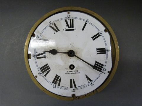 A Smiths brass cased ship's bulkhead timepiece with Cricklewood NW2 to white enamelled Roman dial & Arabic minutes to outer, diameter 23cm