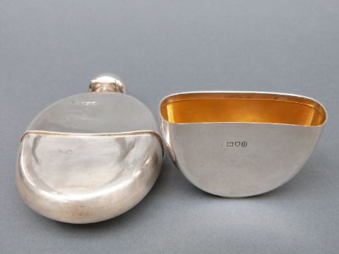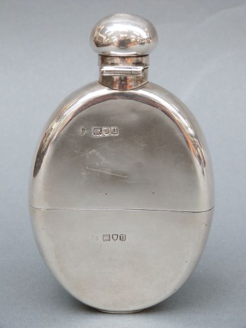 A George V oval shaped hallmarked silver hip flask with pull off cup and bayonet cap, Birmingham 1915, maker's mark rubbed, height 14cm, weight 226g all in