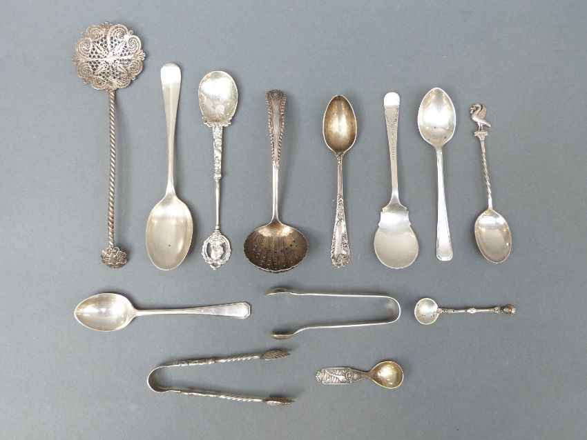 A quantity of hallmarked silver and white metal cutlery including sifter spoons, teaspoons, sugar tongs etc, weight 204g