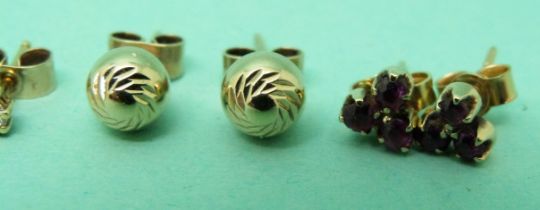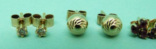 A pair of 9ct gold stud earrings, another 9ct gold pair set with Burmese rubies and a pair of 9ct gold studs set with diamonds