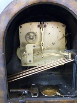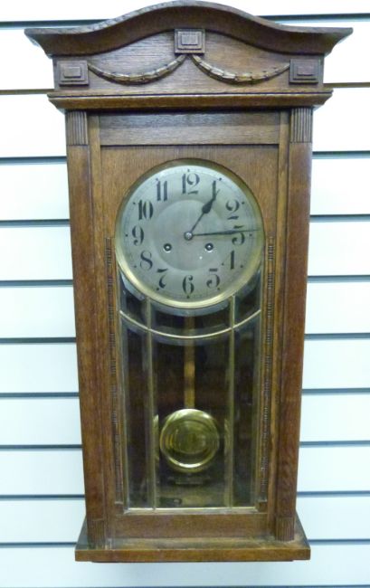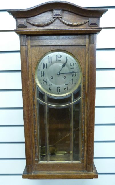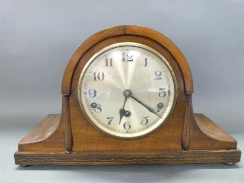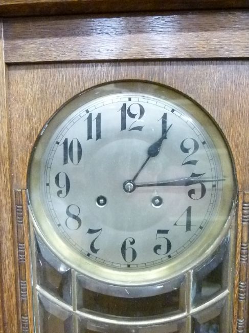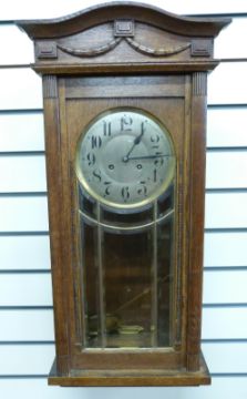 An oak-cased c1910 wall clock in lightly carved case with, bevelled glass door, the silvered Arabic dial with blued spade hands, the two train movement striking on a gong together with a c1930s German 'Napoleon hat' cased mantel clock, Arabic dial with strike/silent facility, the movement no. 14237-13 by D.G.R.A