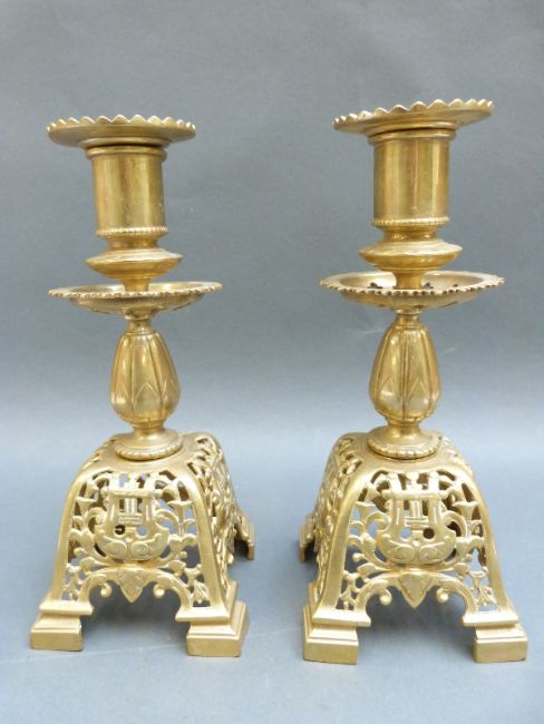 A pair of 19thC pierced gilt candlesticks, height 22cm