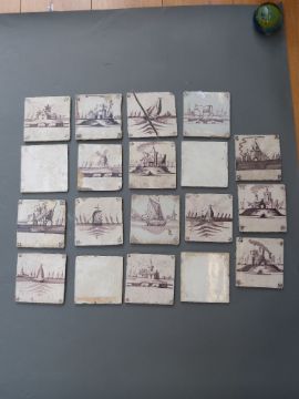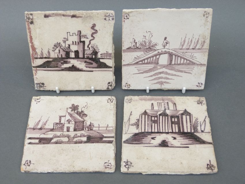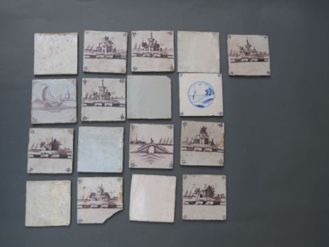 Approximately 56 mainly 18thC manganese and blue and white Delft tiles, mostly continental, decorated with shipping, architectural and pastoral scenes