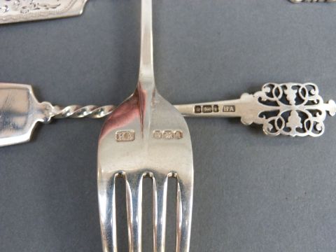 A possibly Masonic 'Join Loyalty and Liberty' hallmarked silver fork, Sheffield 1933, length 18.5cm and a pair of fretwork butter knives, Sheffield 1901, all Atkin Brothers, weight 120g