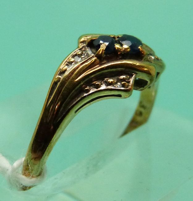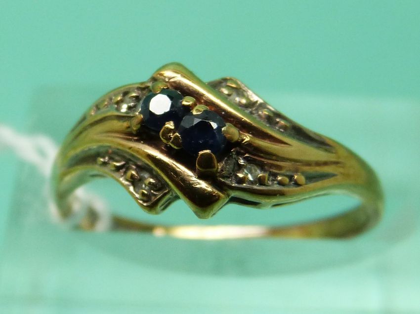 A 9ct gold ring set with two sapphires and diamonds (size L)