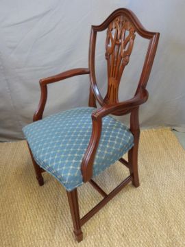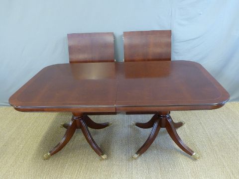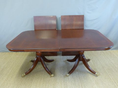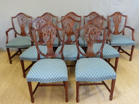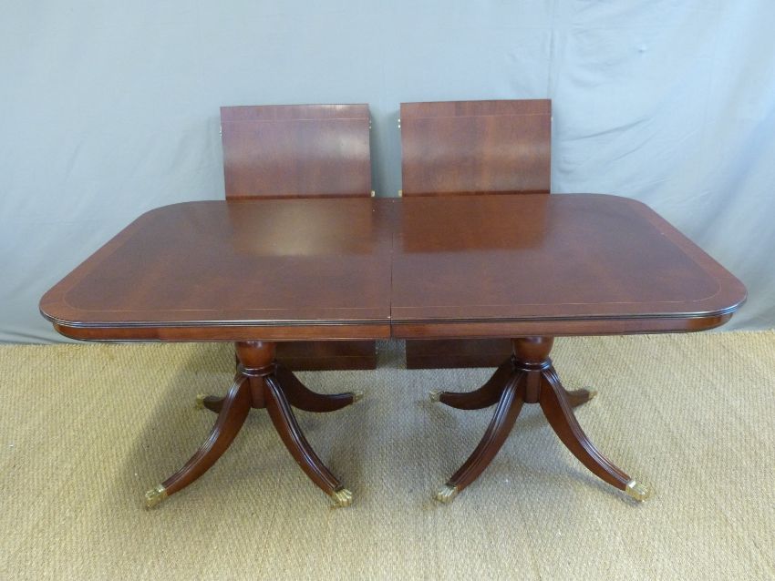 A reproduction dining room table (max length 304, minimum 183, width 111cm) and ten chairs (8+2)