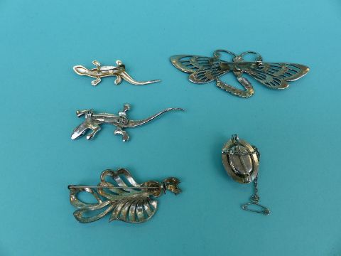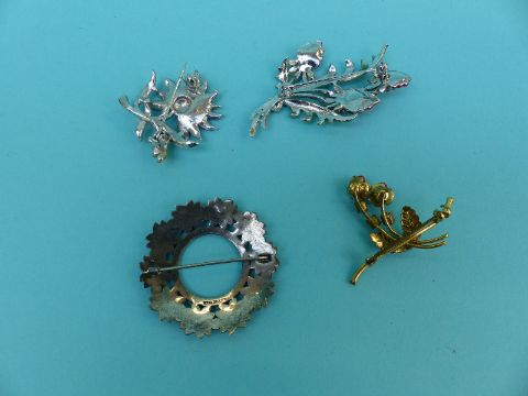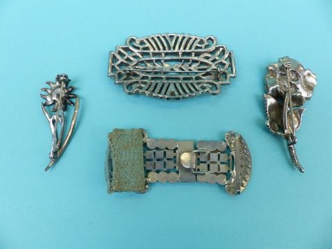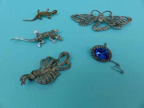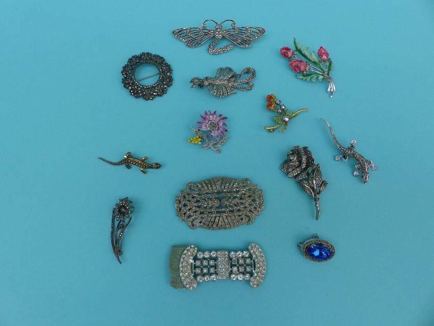 A collection of marcasite brooches including an enamel and marcasite flower and a silver example