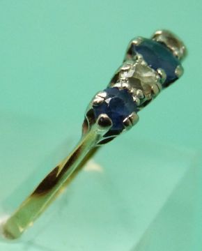 An 18ct gold ring set with three round cut sapphires and two old cut diamonds (size P/Q)