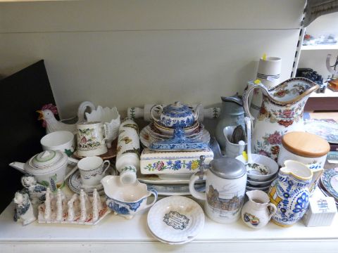 A large collection of various ceramics including Portmeirion rolling pin, Masons Ironstone, Palissy ware etc