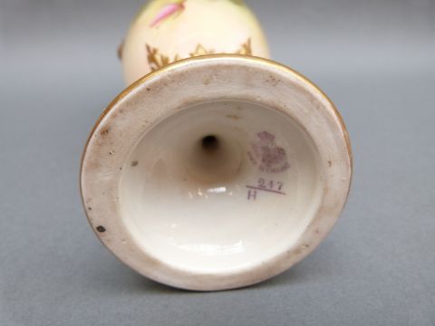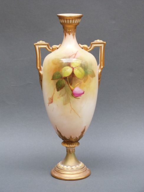 Royal Worcester twin-handled pedestal vase decorated with roses, signed A Shuck, shape H247, 25cm tall