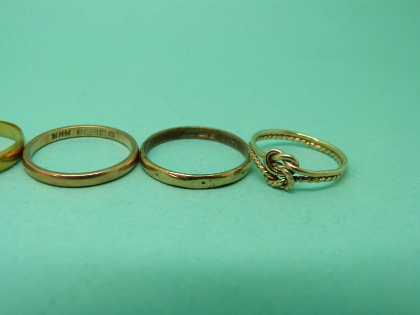 A 22ct gold wedding ring (2.1g), three 9ct gold rings (4.1g) and an 18ct gold ring (1.7g)