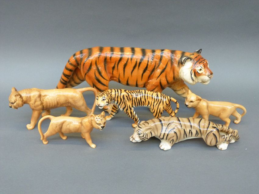 Beswick lion and tiger figures, large Goebel tiger, Szeiler stalking tiger