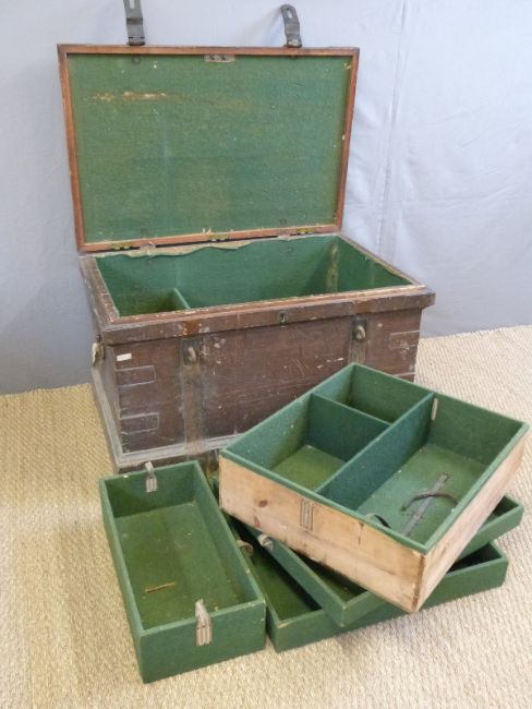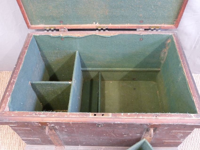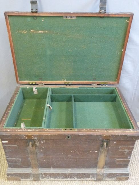 A 19thC metal bound stained pine silver chest/trunk with metal looped handles, the interior with velvet lined three layer multi sectioned compartments to house silver items ((W98 x D66 x H58cm)