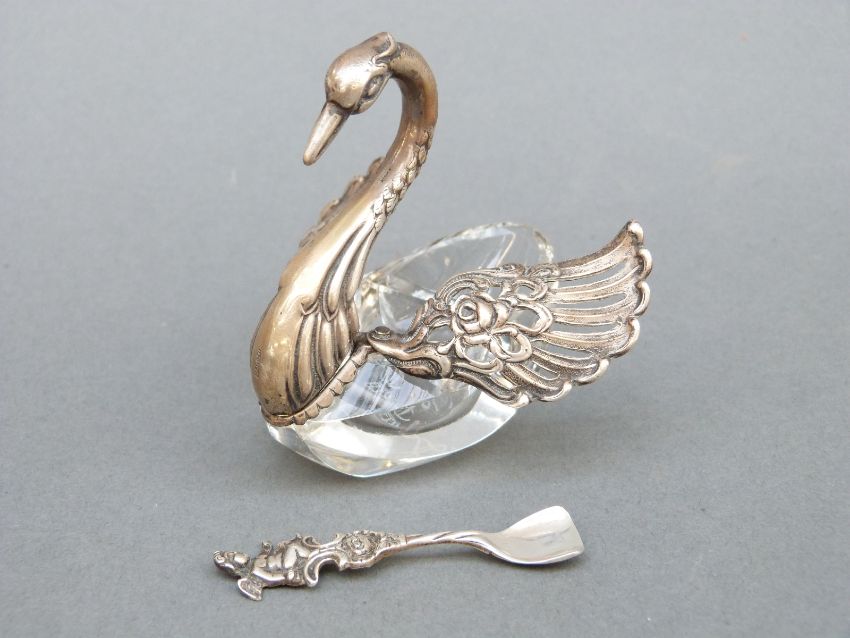 A glass and white metal novelty salt in the form of a swan with articulated wings, marked 835, length 7.5cm