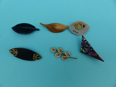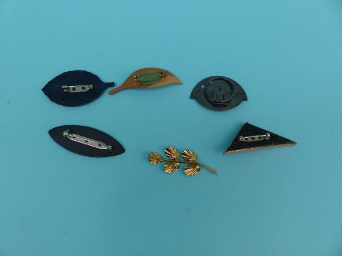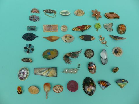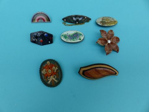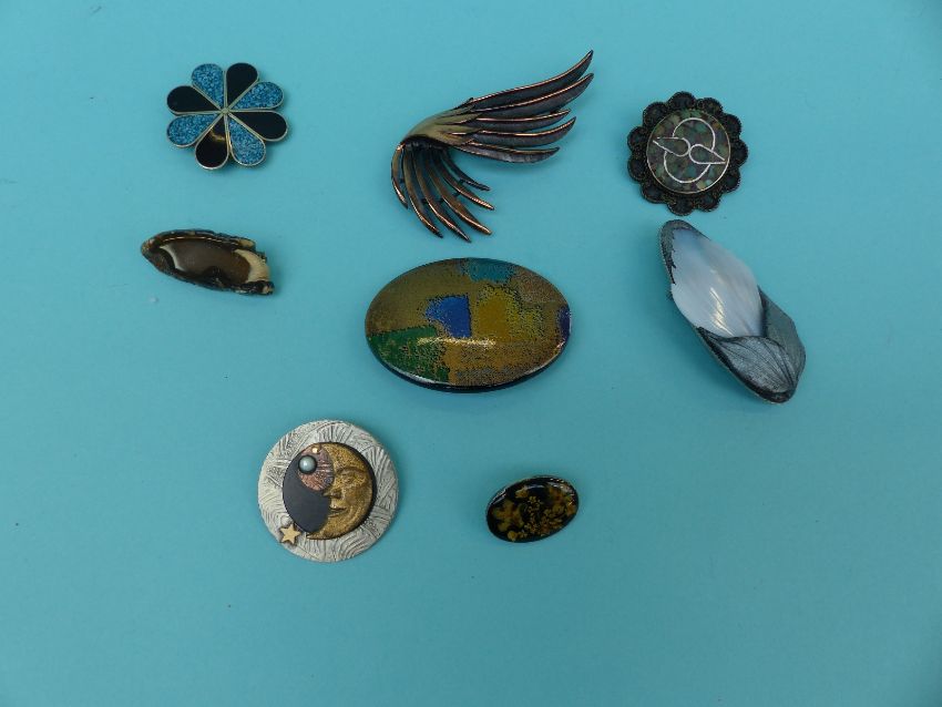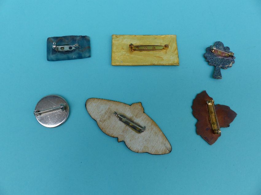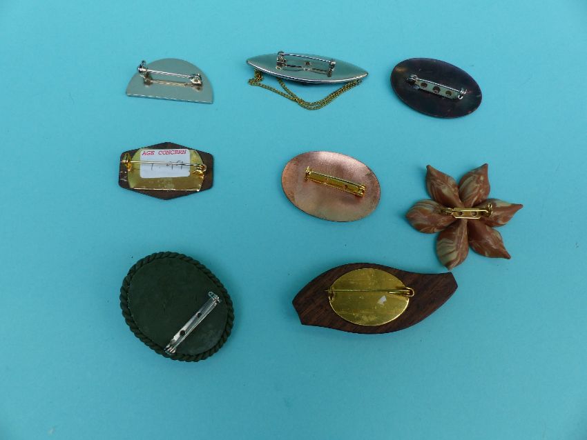 A collection of brooches to include enamel floral examples, wooden brooch, signed Russian lacquered etc