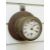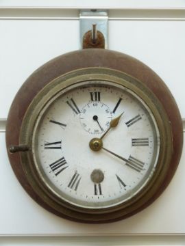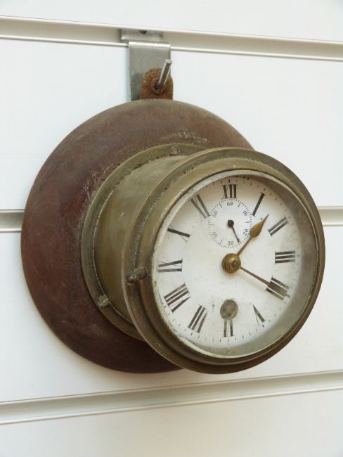 An unusual small brass cased vintage vehicle car/charabanc yacht bulkhead or early signal box clock, the white enamelled Roman dial with Arabic secondary seconds and brass spade hands, mounted on wooden wall mount clock, diameter 11cm