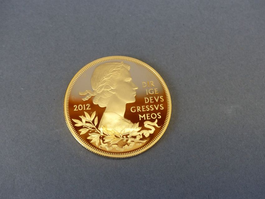 A cased gilt Royal Mint commemorative crown 2012 together with a further three examples with stamp covers