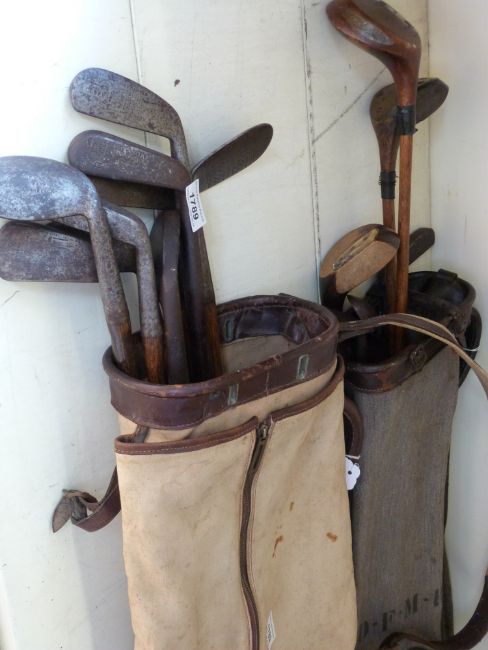 Sixteen hickory shafted golf clubs including Fairlies patent, Tedder, L Holland etc in two vintage bags