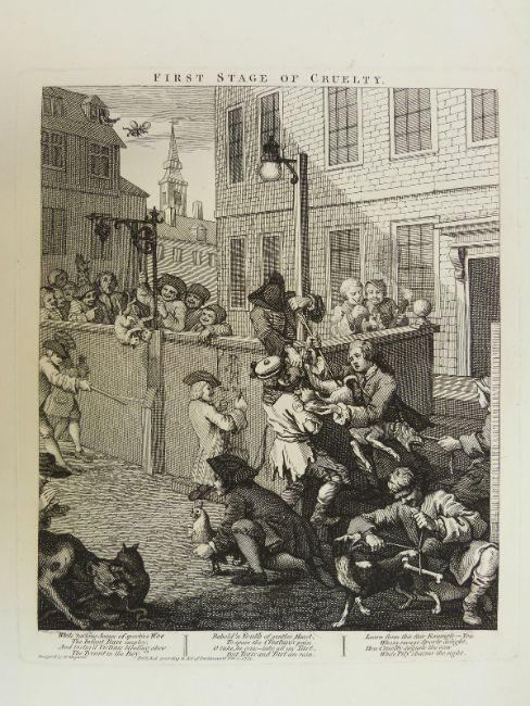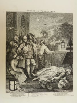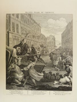 Four Hogarth etchings Cruelty comprising First Stage, Second Stage, Perfection and Reward, each approximately 65 x 49cm