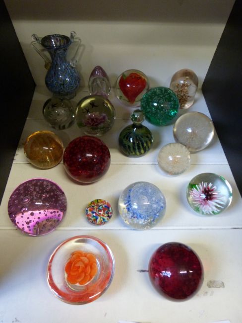 Twenty various glass paperweights including Mdina together with a millefiore glass vase.