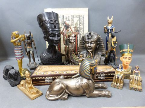 A collection of Egyptian figures and an inlaid box, some items from the myths and legends series